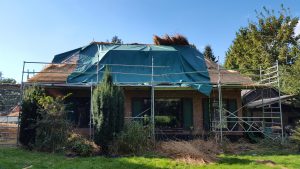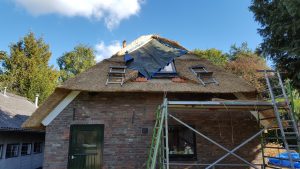 Over de nieuwe dakbalken is een laag houten platen gekomen. Dit zijn constructieplaten die water werend zijn en die ervoor zorgen dat we nu een gesloten kap hebben, in plaats van een open kap zoals eerst. Bij een open kap kun je namelijk vanbinnen in het huis het riet zien liggen op de dakbalken. Over deze houten platen zie je dat Herbert nog een laag heeft aangebracht. Dit is een laag met vochtwerende folie. Dit zorgt ervoor dat enig vocht dat toch onder het riet terecht kan komen (bijvoorbeeld wanneer het over de jaren flink versleten en dunner is geworden) niet verder door kan dringen het huis in. Wel zo fijn, niet?