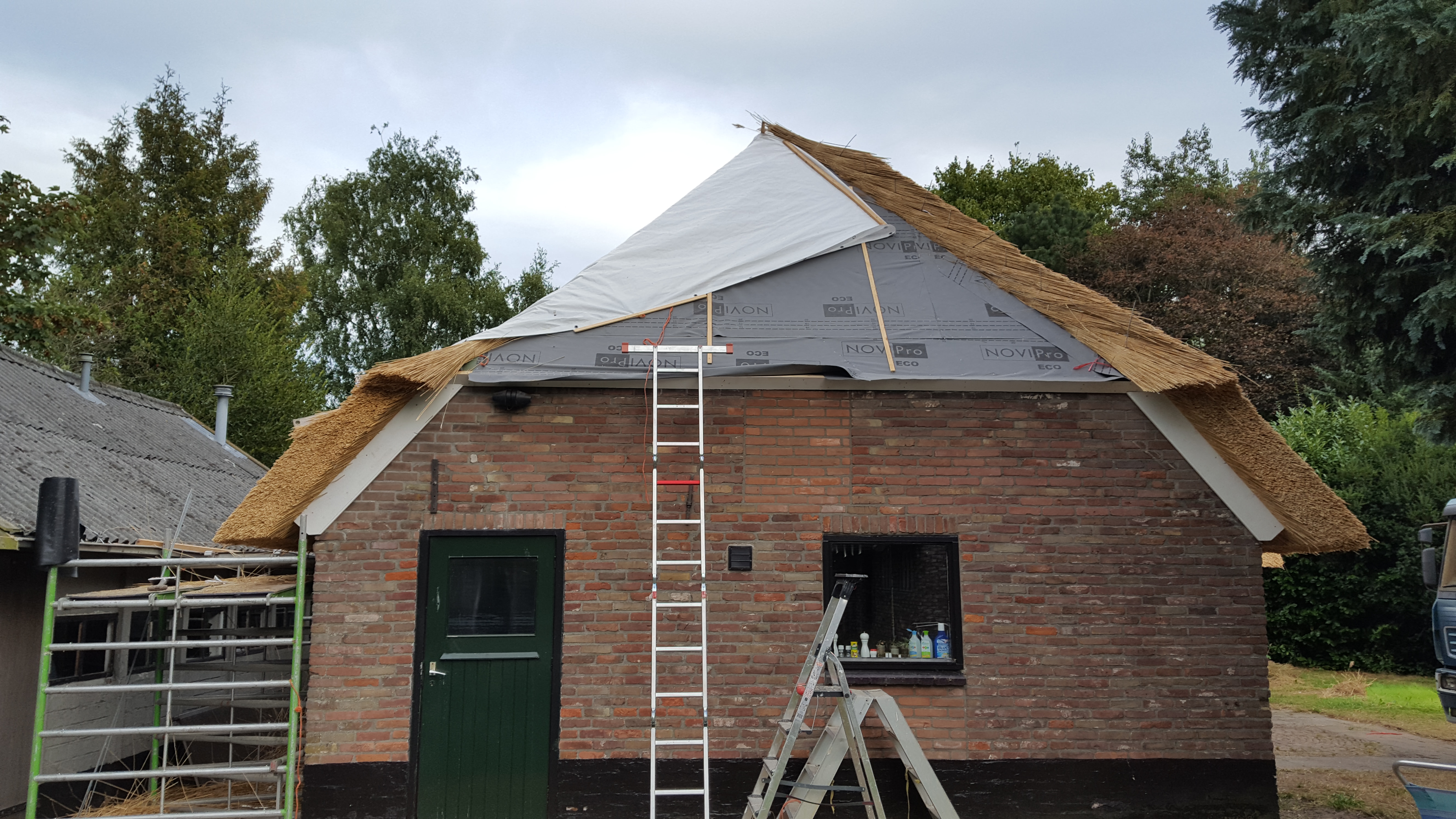 Over de nieuwe dakbalken is een laag houten platen gekomen. Dit zijn constructieplaten die water werend zijn en die ervoor zorgen dat we nu een gesloten kap hebben, in plaats van een open kap zoals eerst. Bij een open kap kun je namelijk vanbinnen in het huis het riet zien liggen op de dakbalken. Over deze houten platen zie je dat Herbert nog een laag heeft aangebracht. Dit is een laag met vochtwerende folie. Dit zorgt ervoor dat enig vocht dat toch onder het riet terecht kan komen (bijvoorbeeld wanneer het over de jaren flink versleten en dunner is geworden) niet verder door kan dringen het huis in. Wel zo fijn, niet?